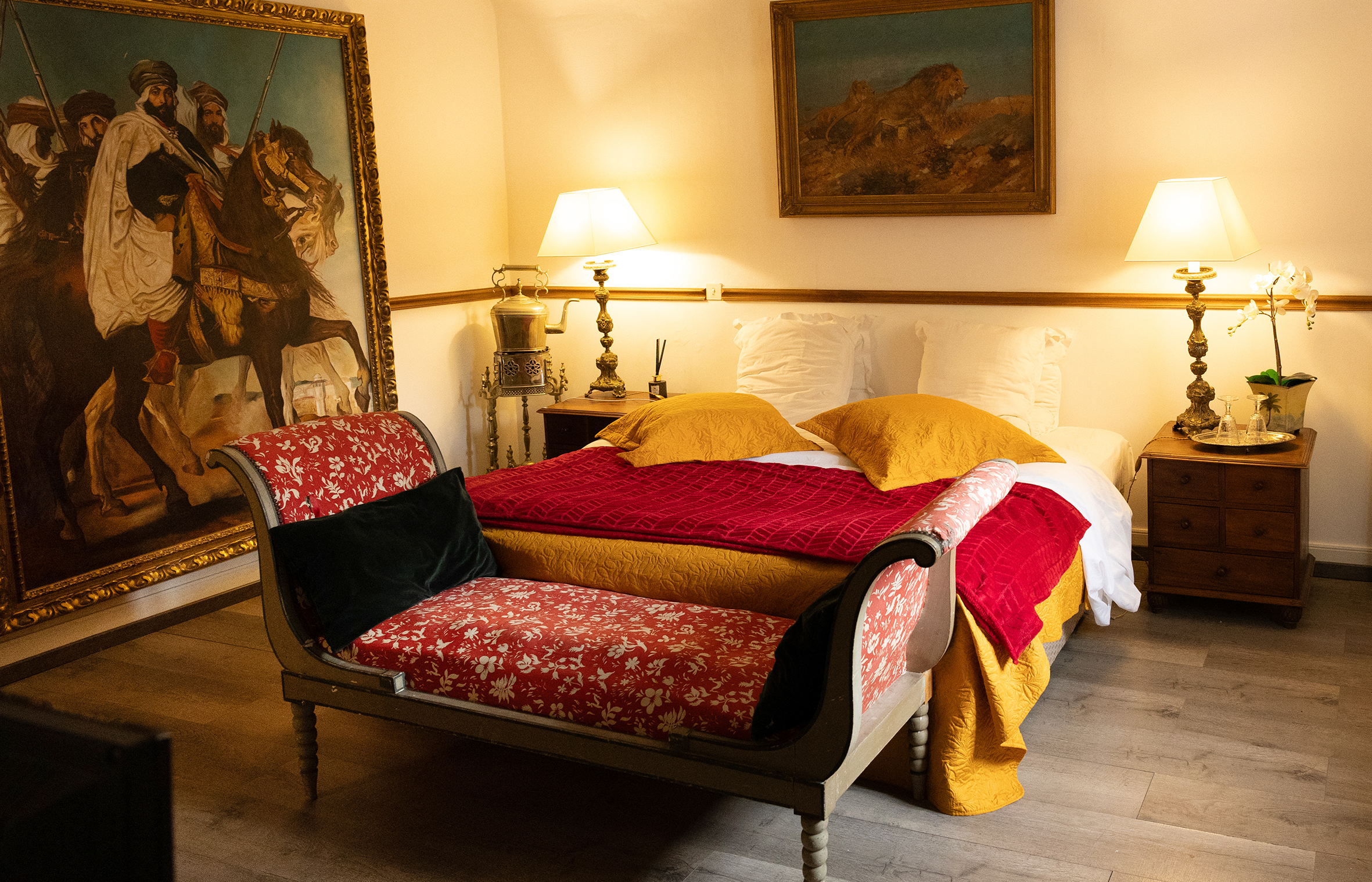 Baignée dans des tons doux de beige et jaune, la Chambre Chinoise évoque sérénité et raffinement. L’ambiance harmonieuse et lumineuse invite au voyage et à l’évasion. Un espace apaisant où l’élégance asiatique se mêle à la tranquillité.
